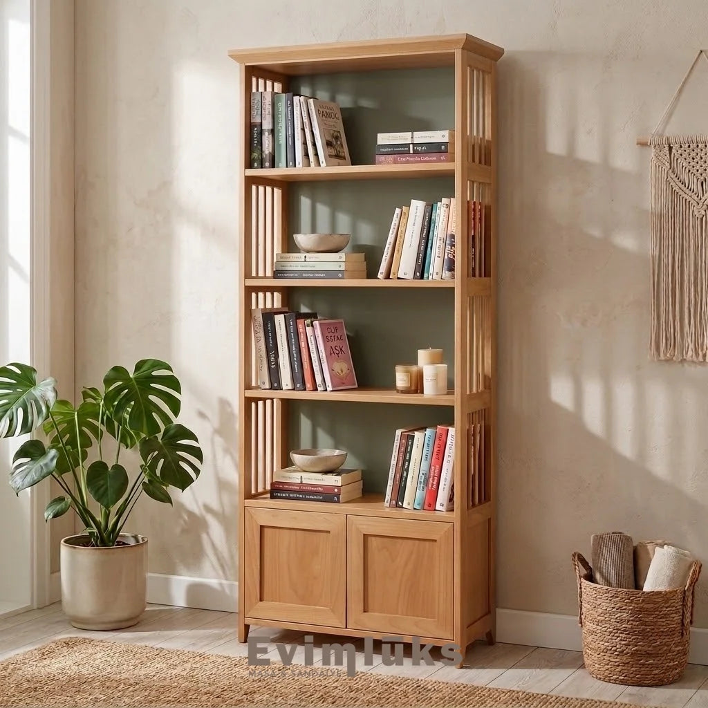 Salonunuzda veya okuma köşenizde taze bir nefes arıyorsanız, kitaplığın doğal ahşap tonunu arka panelde soft bir adaçayı yeşili ile tamamlayın. Yanlardaki ızgaralı boşluklardan süzülen ışık, bu açık tonlarla birleştiğinde mekanınıza muazzam bir "Japandi" veya İskandinav aydınlığı katar.