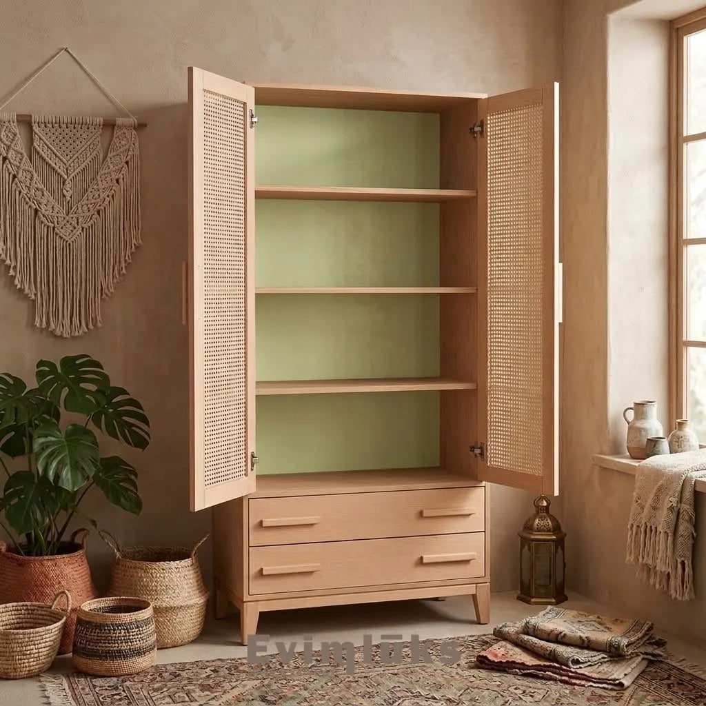 Mekanınızda daha aydınlık, huzurlu ve "Boho-Chic" bir atmosfer hayal ediyorsanız, kayın ağacının ve hazeranın kendi doğal açık sarı/bej tonlarını koruyun. Bu doğallığı bir adım öteye taşımak için dolabın iç arka panelini soft bir adaçayı veya pastel yeşil tonuna boyayarak, kapağı açtığınızda mekana ferah bir derinlik katan sürpriz bir detay yaratabilirsiniz.