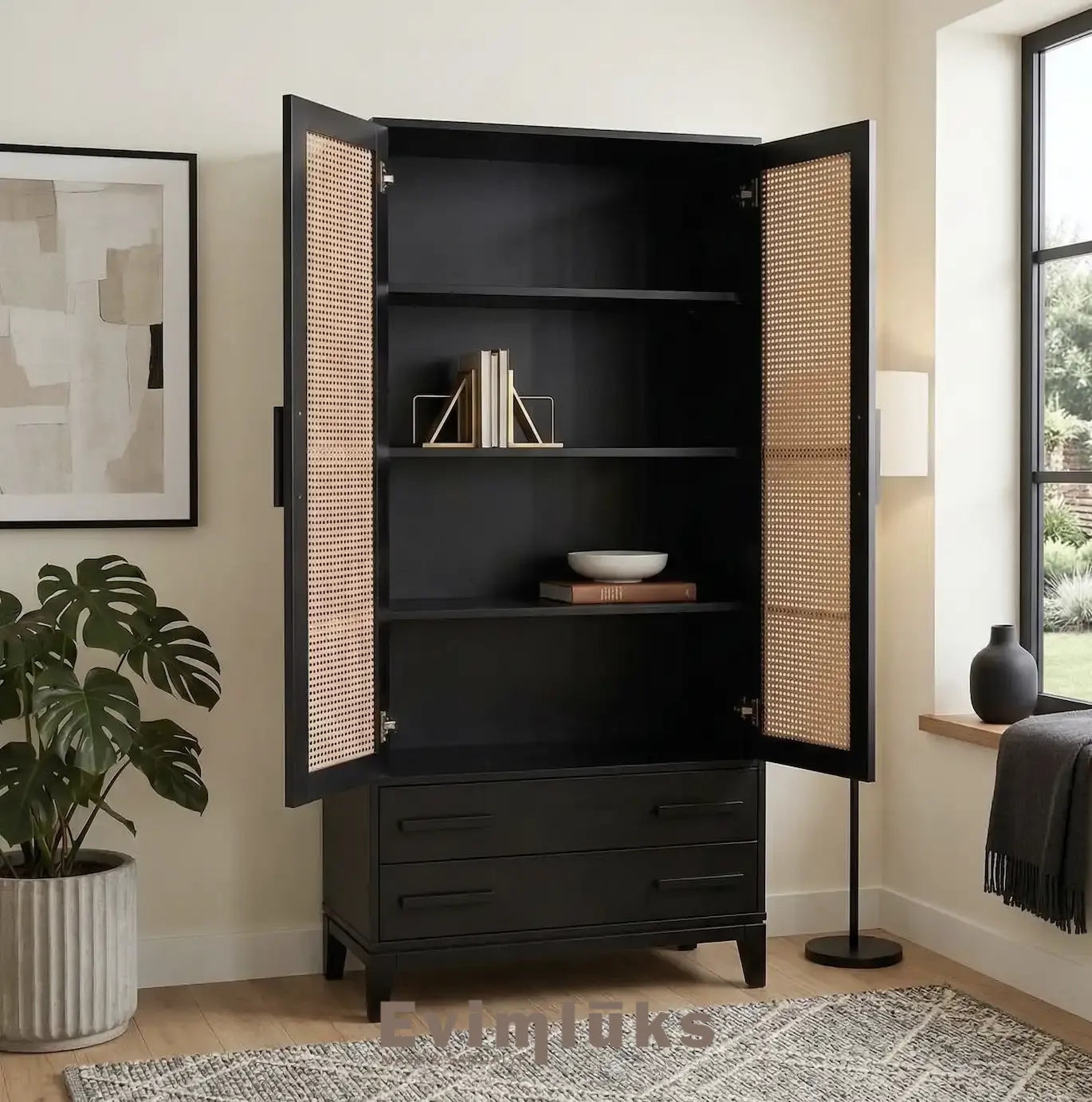 Hem geniş bir depolama alanı hem de mekanın ferahlığını bozmayacak hafif bir tasarım arıyorsanız, bu hazeran kapaklı kitaplık tam size göre! Geleneksel hasır örme sanatını modern hatlarla buluşturan bu model, boydan boya uzanan kapakları sayesinde dağınıklığı şık bir şekilde gizlerken, odanızda "Boho-Chic" ve aydınlık bir atmosfer yaratır. Alt kısımdaki iki geniş çekmece ise ekstra fonksiyonellik sunar.