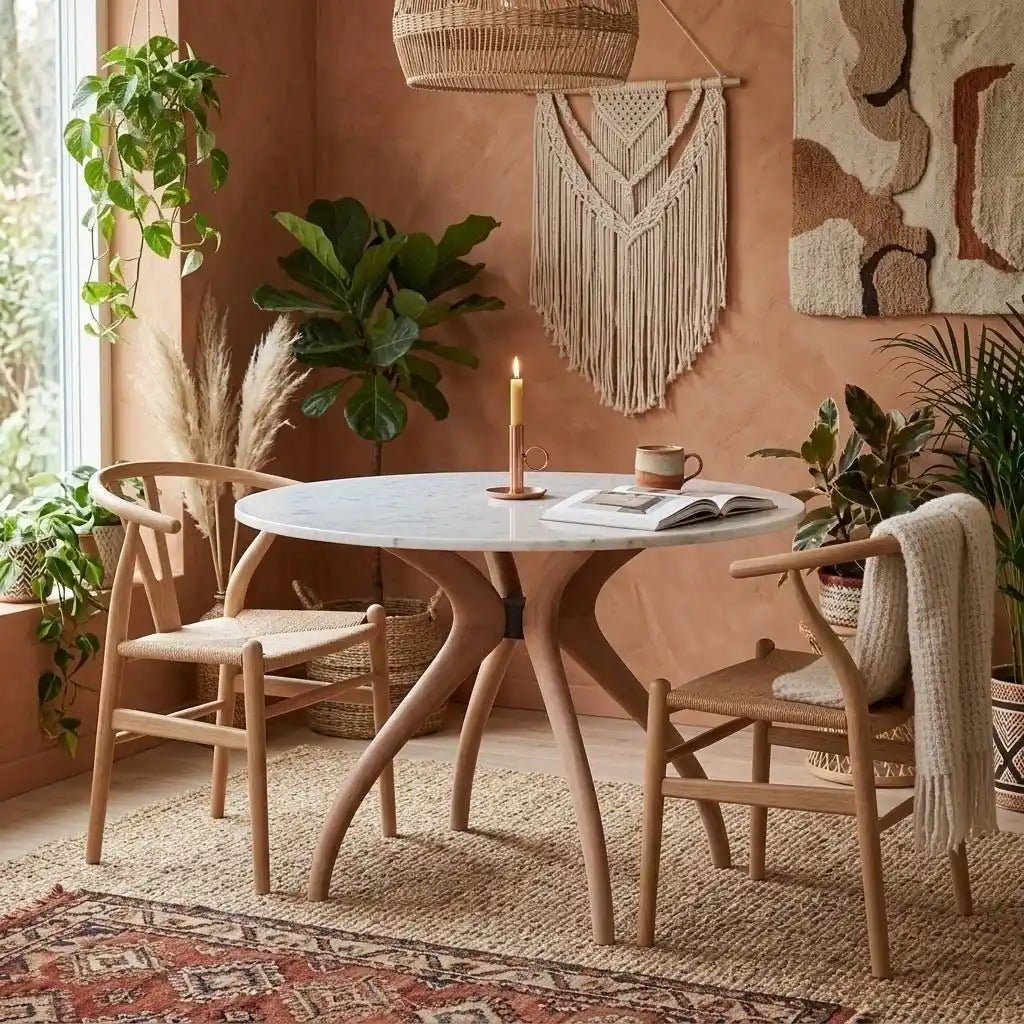 • Tarz İpucu (Kombinasyon): Masanızı, mermerin damarlarındaki o sıcak tonları vurgulayan kiremit veya terracotta rengi kadife sandalyelerle çevreleyerek, 70'lerin retro şıklığını modern bir dille bugüne taşıyın.