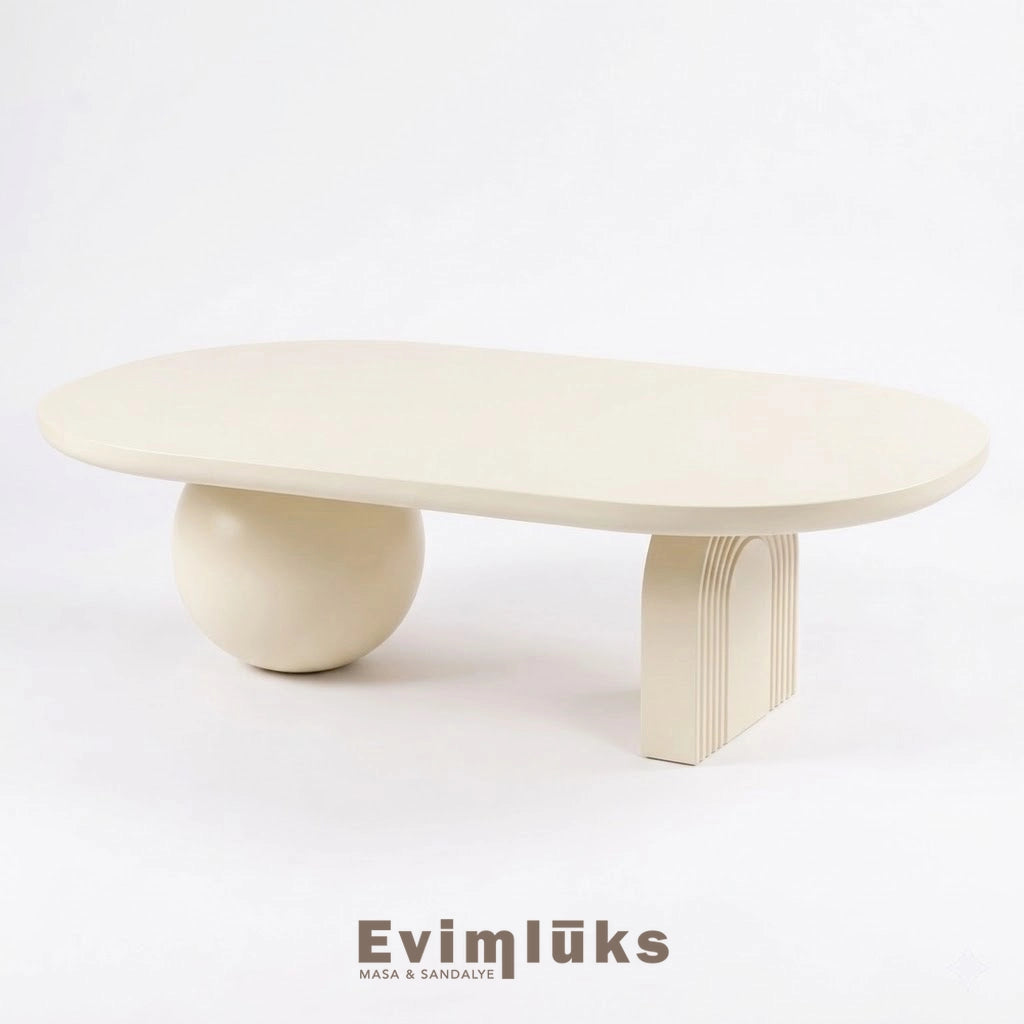 • Tasarım: Organik formlu oval üst tabla ve asimetrik formlu (Küre + Yivli Kemer) heykelsi ayaklar.