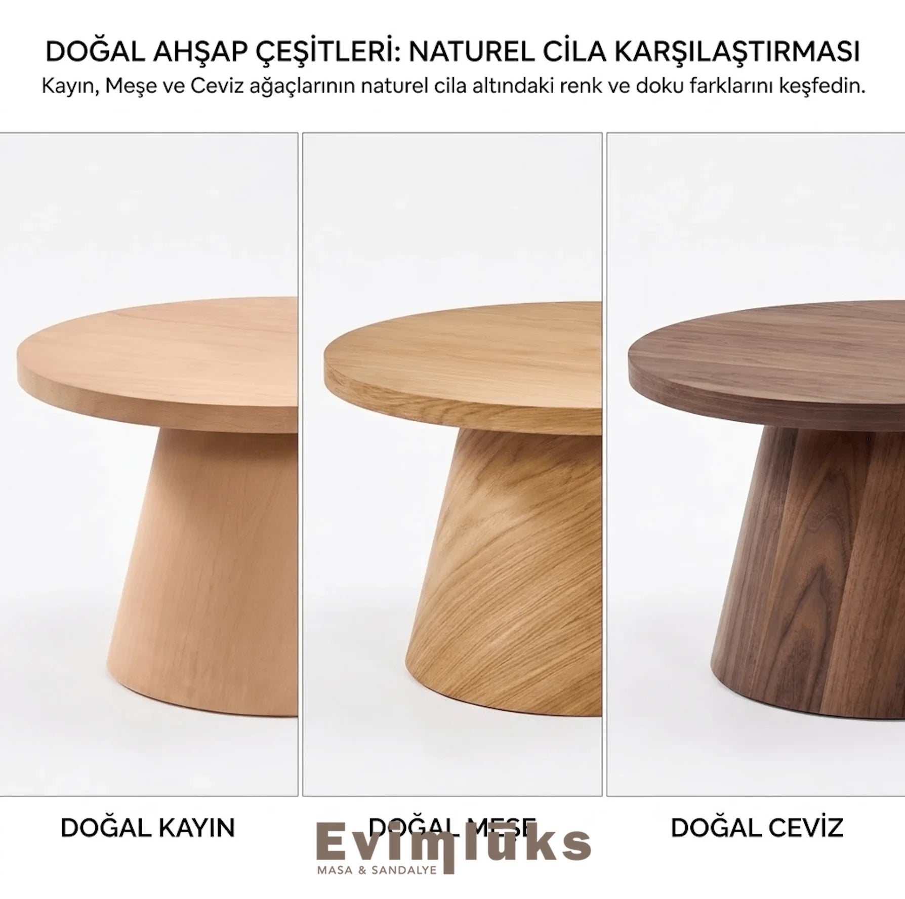 Gerçek Doğal Kaplama ve Masif Güç Bu ürünü sıradan mobilyalardan ayıran en büyük fark, hem ayakların hem de tablanın gerçek doğal ağaç kaplama ile donatılmış olmasıdır. Yapay dokulardan uzak, ağacın gerçek nefesini ve damar yapısını hissedebileceğiniz üç farklı karakter arasından seçiminizi yapın: