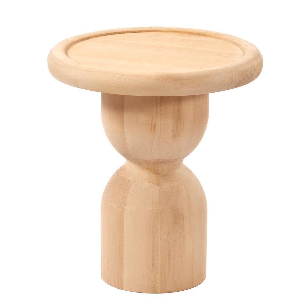 Modern dekorasyonun sanatsal dokunuşla buluştuğu nokta: Biblo formu. Geleneksel ahşap torna işçiliğinin modern ve heykelsi bir yorumu olan bu özel tasarım, ince bel kıvrımı ve dolgun taban yapısıyla mekanınıza adeta bir sanat eseri zarafeti taşıyor. Eşyalarınızın güvenle durmasını sağlayan çerçeveli (havuzlu) yuvarlak tablası ise estetiği fonksiyonellikle birleştiriyor. Kendi yaşam alanınızın ruhuna uygun olarak kişiselleştirebilmeniz için hiçbir kimyasal işlem görmemiş, pürüzsüz ve ham formunda sizi bekliyor.