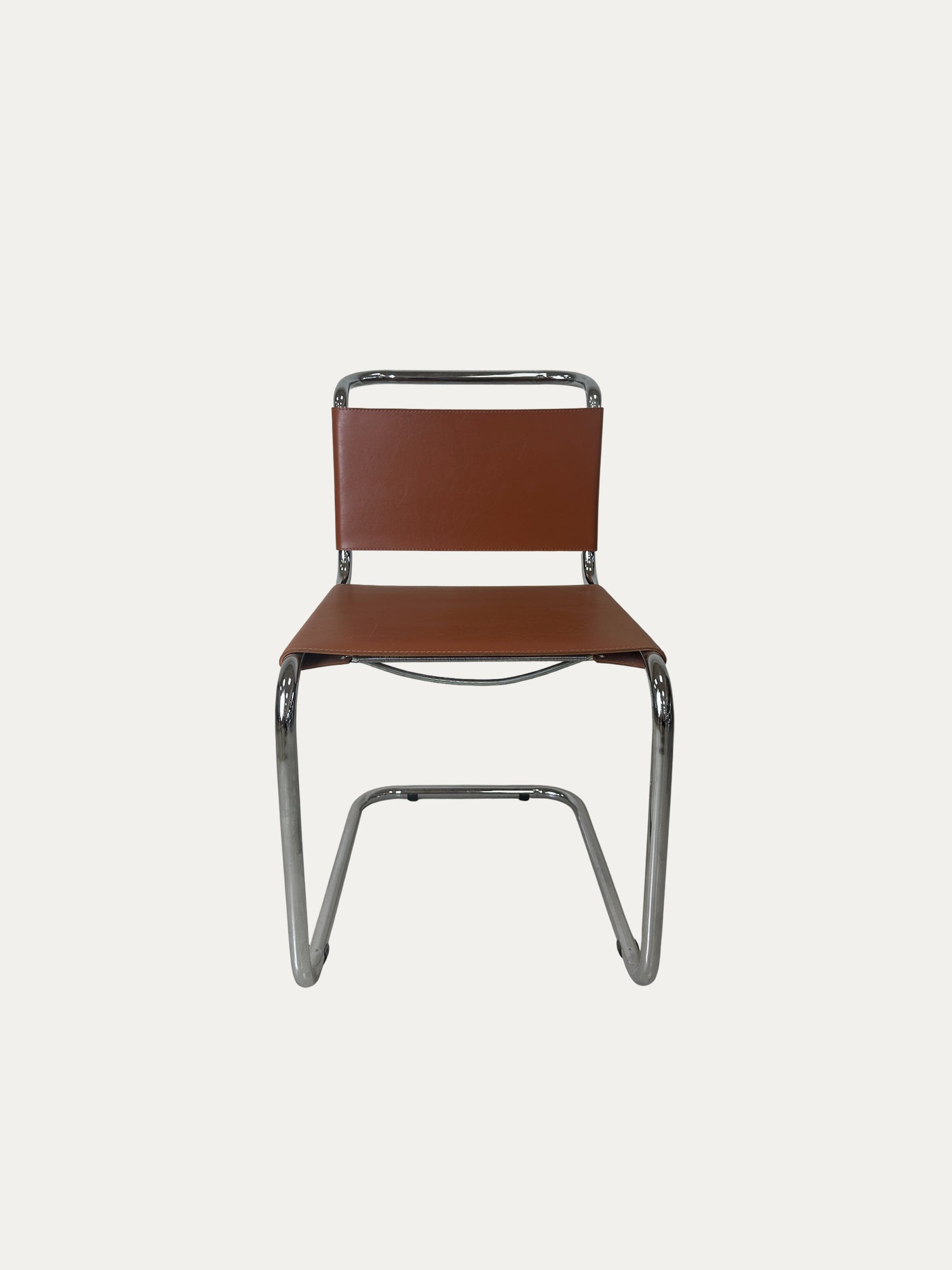 s33 ikonik metal sandalye ön görünüm krom kaplama metal iskelet kahverengi deri oturum ve sırt cantilever modern tasarım ürün fotoğrafı