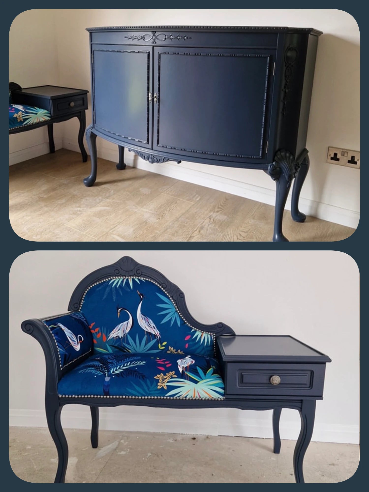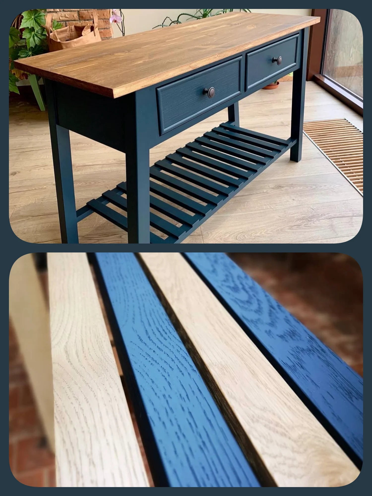 Pirinç ve Ceviz Uyumu: Özel üretim kitaplıklarınızda, masa ayaklarında veya konsollarınızda bu koyu puslu laciverti, doğal ceviz ahşabı ve eskitme pirinç (gold) detaylarla kombinleyerek zamansız bir başyapıt yaratabilirsiniz.