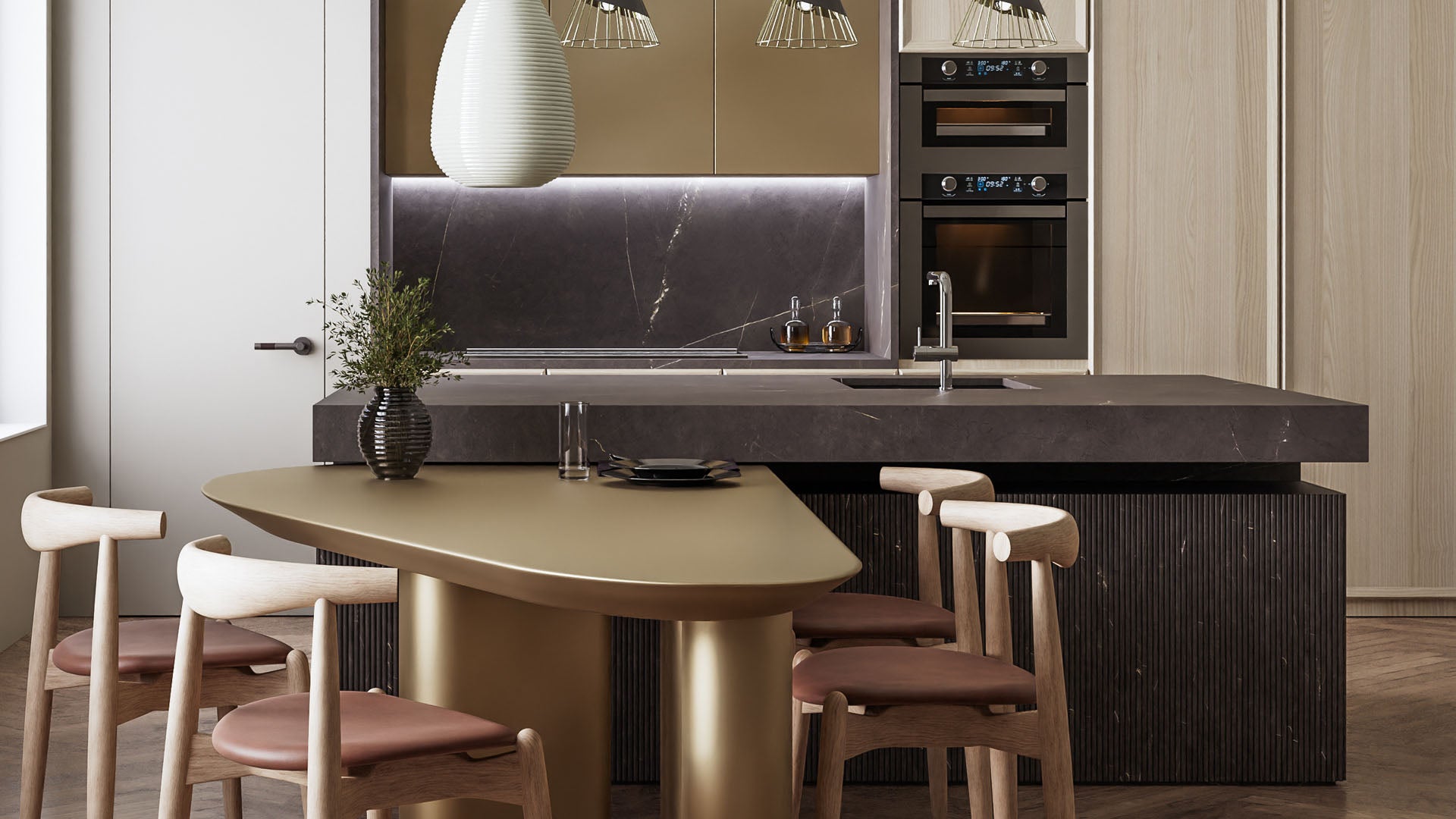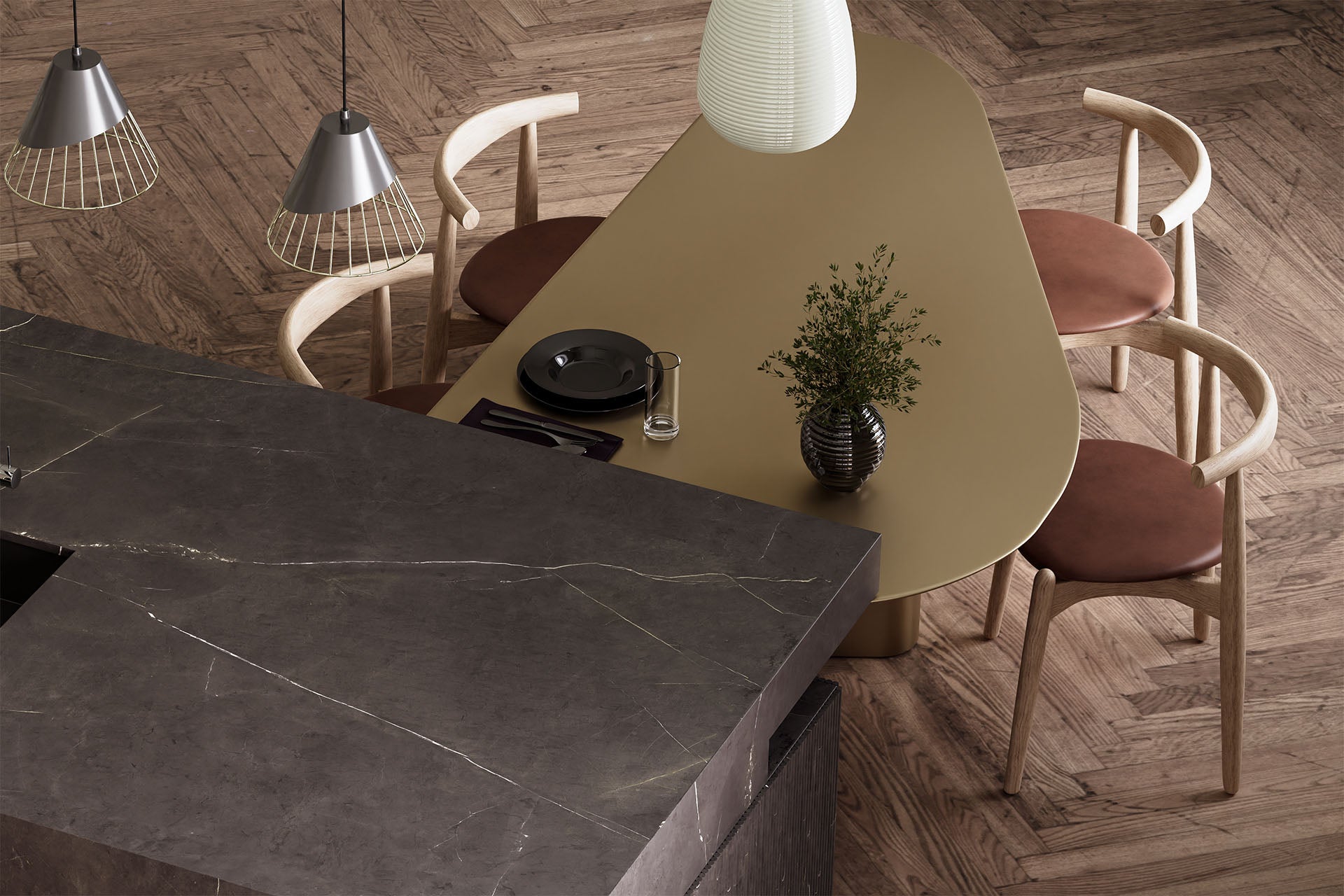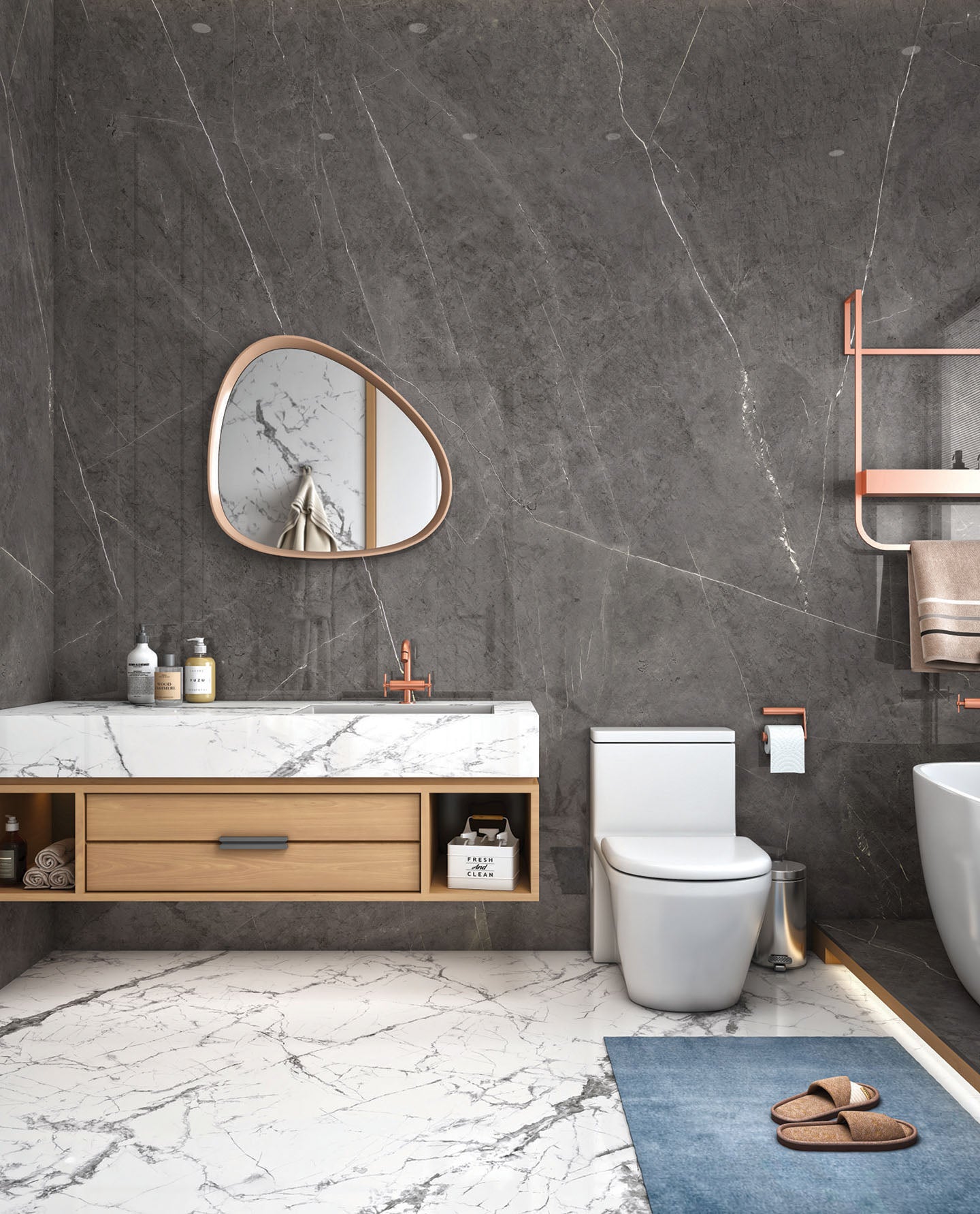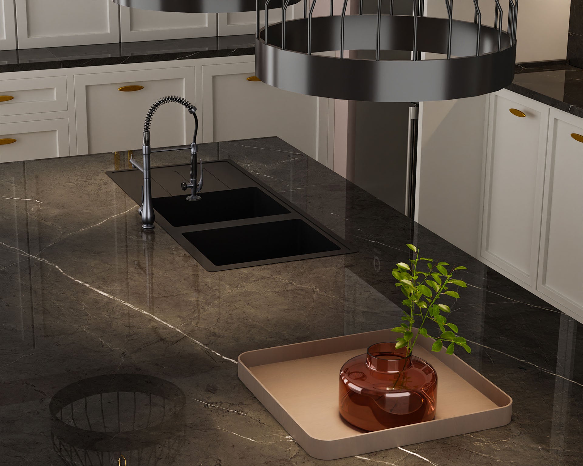 Pietra Grey’de zarafet daha yoğun yaşanır. Koyu kül rengi zemine özenle işlenmiş kirli beyaz damarlar, mekâna incelikli ama etkileyici bir şıklık katıyor.