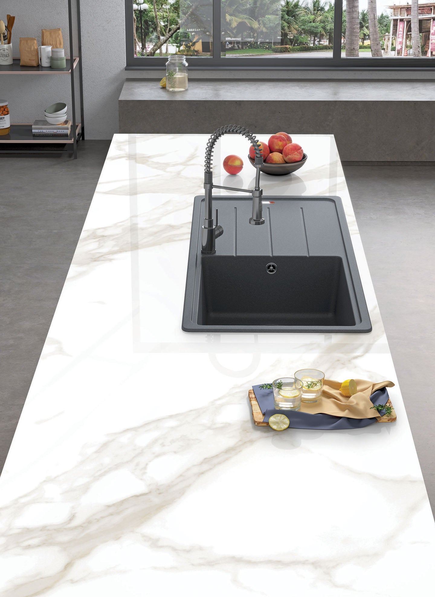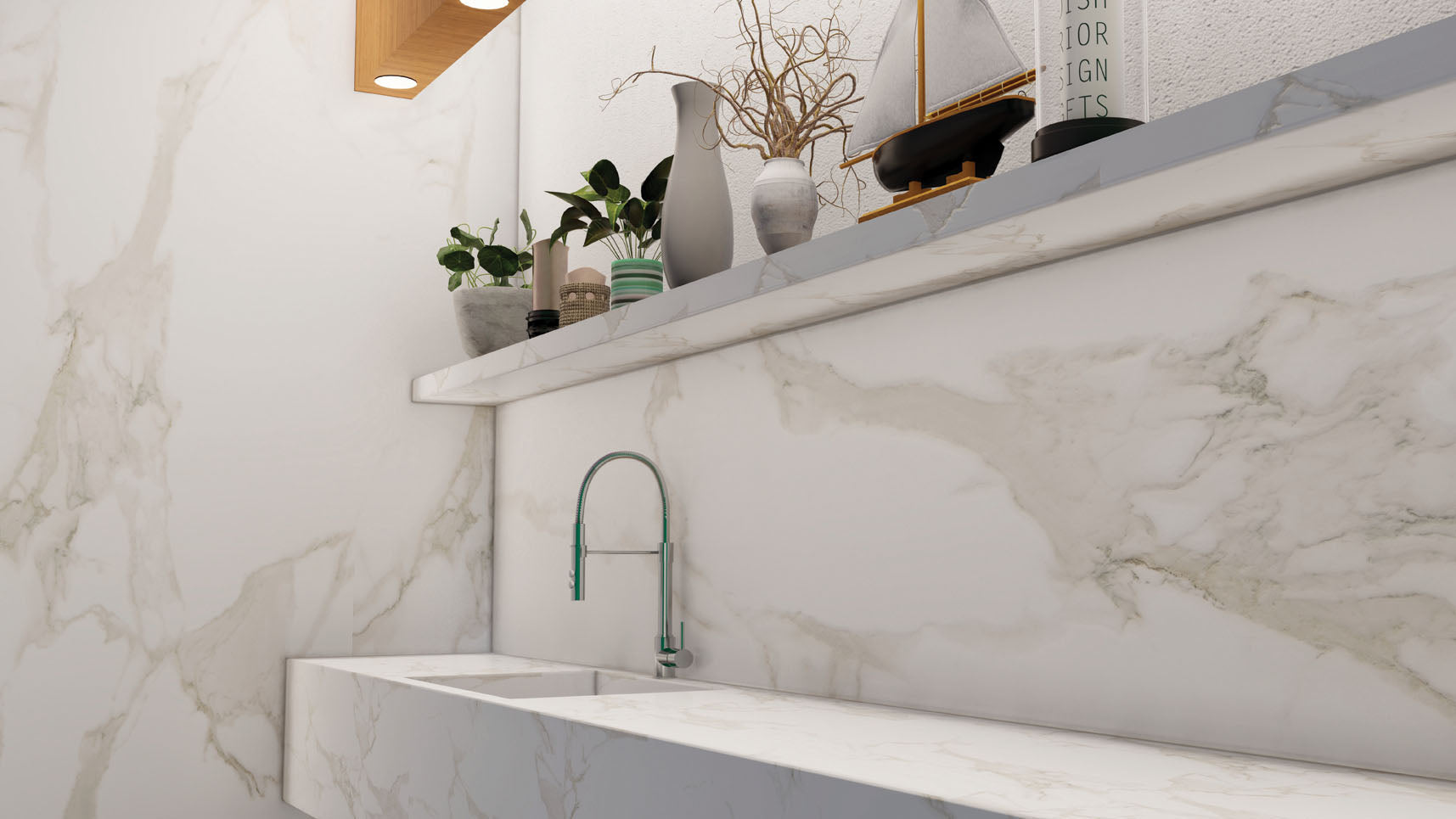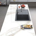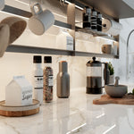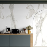 Statuario Elit ile tasarlanmış mekânlarda huzur kendini hissettiriyor. Pastel beyaz yüzey, yaygın ve ince gri damarlarla birleşerek daha yumuşak bir görünüm kazanıyor ve hafif, dingin bir çekicilik sunuyor.